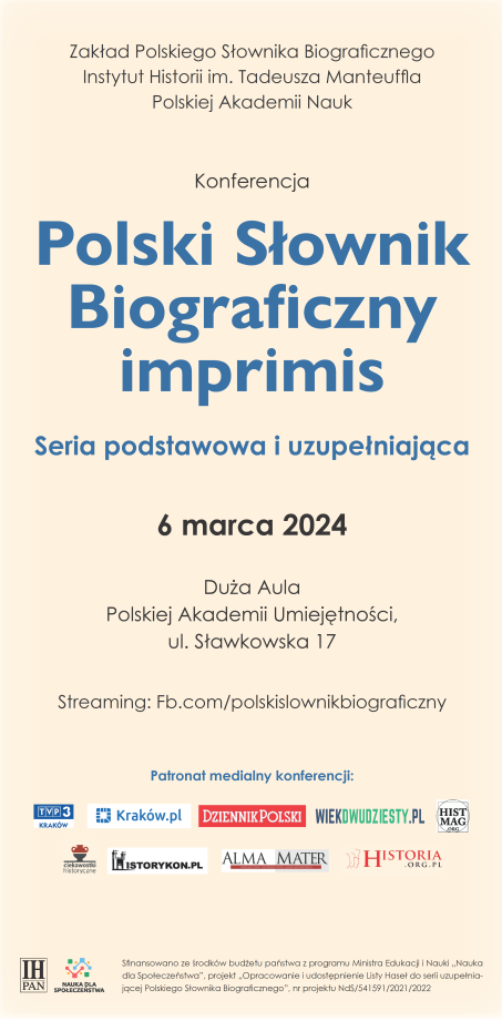 Konferencja jest częścią projektu Opracowanie i udostępnienie Listy Haseł do serii uzupełniającej „Polskiego Słownika Biograficznego” realizowanego od 2022 r. w ramach programu Ministra Edukacji i Nauki pod nazwą „Nauka dla Społeczeństwa” (NdS/541591/2021/2022) w Zakładzie Polskiego Słownika Biograficznego Instytutu Historii im. Tadeusza Manteuffla Polskiej Akademii Nauk.